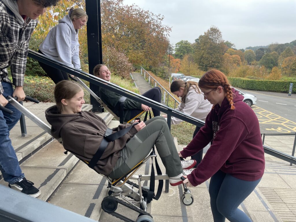 The photo shows two teams at Stirling using special chairs with tracks so they can descend without lifting. They aren’t racing!