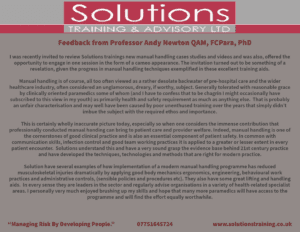 “I was recently invited to review Solutions Training’s new manual handling case studies and videos and was also, offered the opportunity to engage in one session in the form of a cameo appearance. The invitation turned out to be something of a revelation, given the progress in manual handling techniques exemplified in these excellent training aids.